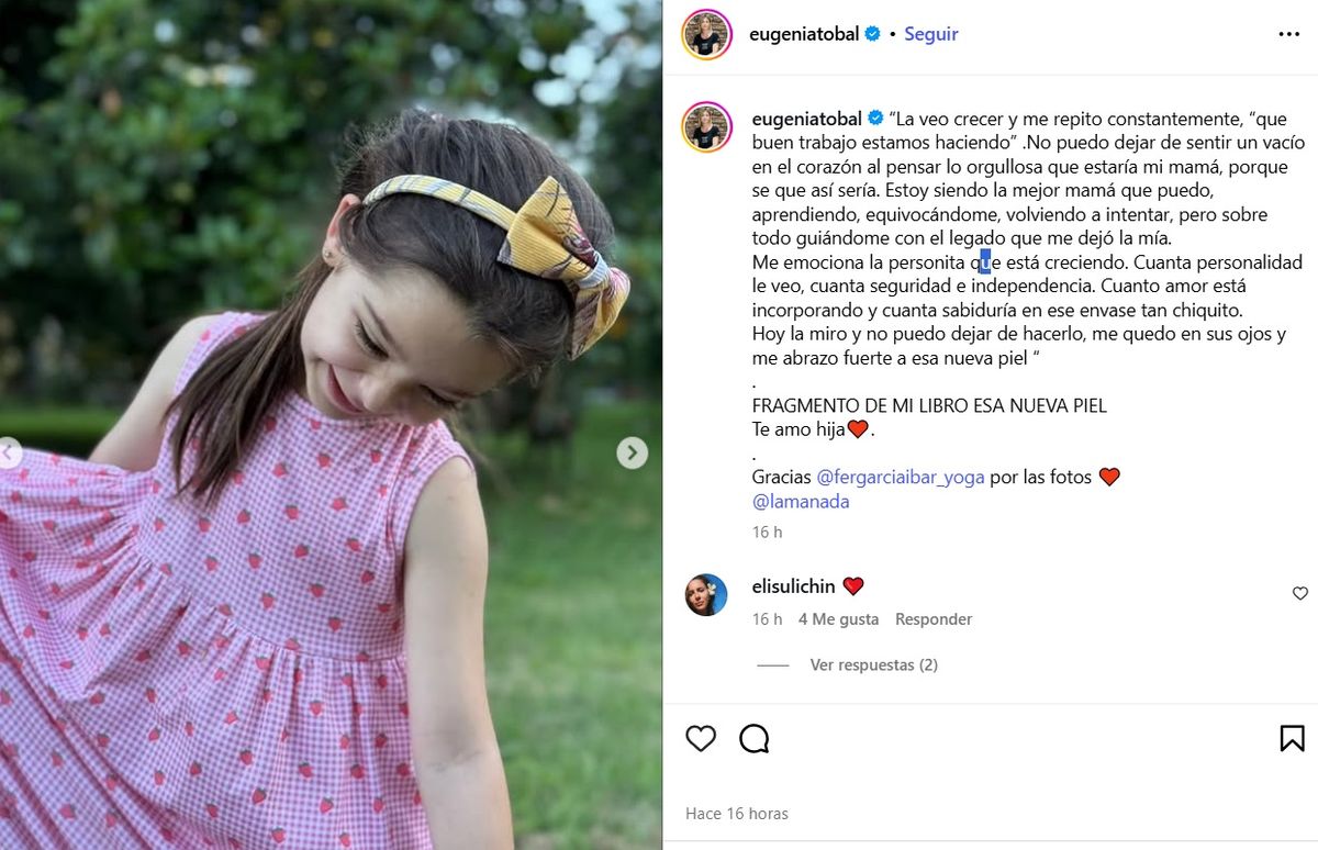 "Me emociona la personita que está creciendo. Cuanta personalidad le veo, cuanta seguridad e independencia. Cuanto amor está incorporando y cuanta sabiduría en ese envase tan chiquito", remarcaba Eugenia Tobal junto a una imagen de su pequeña hija.