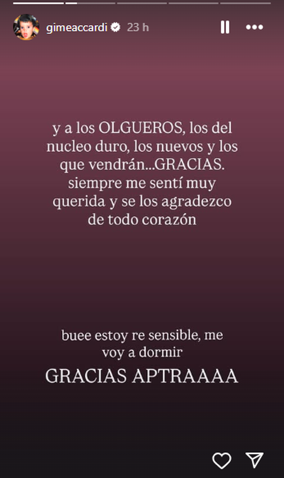 “Hacer mesa con Migue y Luqui (y ahora con Benji) es de lo más lindo que me pasó a nivel laboral (y eso que laburo hace veintiséis años)”, agregó Gime, y aprovechó para agradecer al equipo detrás de cámara, a quienes definió como “magos cumpliendo delirios con calidad y amor”.