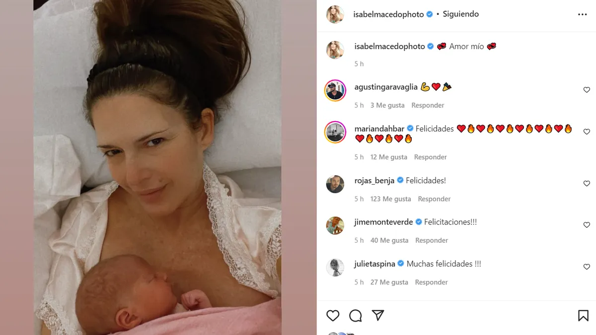 En la postal, Julia está en brazos de su hermana, Belita. "Ahora sí", escribió Isabel Macedo y agregó el emoji de un corazón. La actriz también colgó una imagen, donde está sonriente con la niña recostada en su pecho.