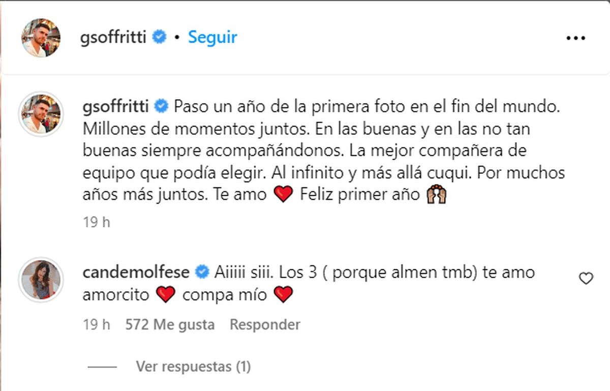El romántico mensaje de Gastón Soffritti a Cande Molfese por su primer aniversario: "La mejor..."