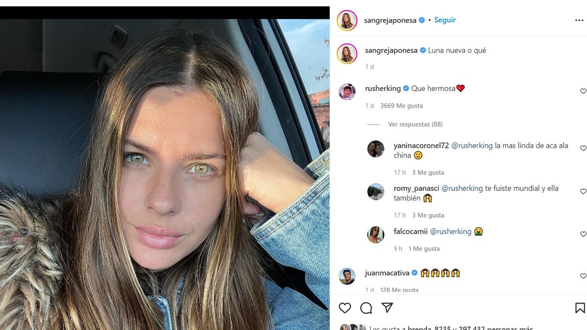 Lo cierto es que ahora quien devolvió el piropo virtual fue Rusherking, quien reaccionó a una selfie de la actriz en el auto. "Luna nueva o qué", expresó la madre de Rufina, Magnolia y Amancio en Instagram.