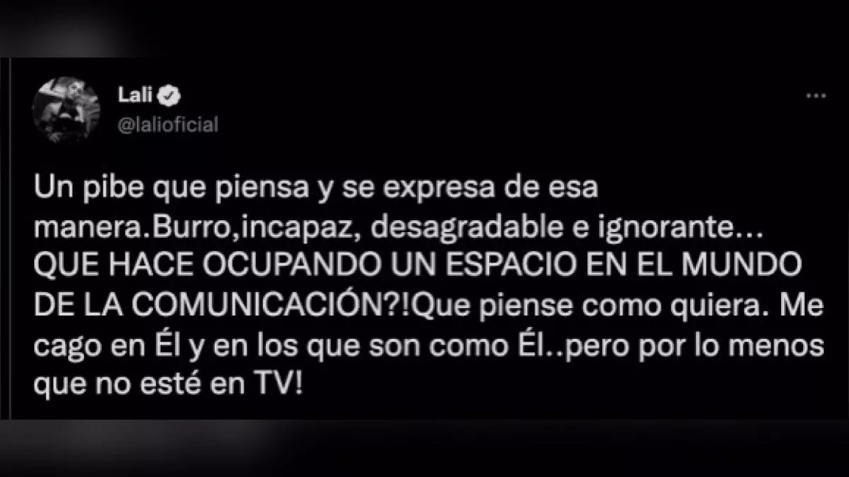 "Un pibe que piensa y se expresa de esa manera. Burro, incapaz, desagradable e ignorante... ¿QUÉ HACE OCUPANDO UN ESPACIO EN EL MUNDO DE LA COMUNICACIÓN? Que piense como quiera. Me cag... en él y en los que son como él... ¡Pero por lo menos que no esté en TV!", arrojó Lali.