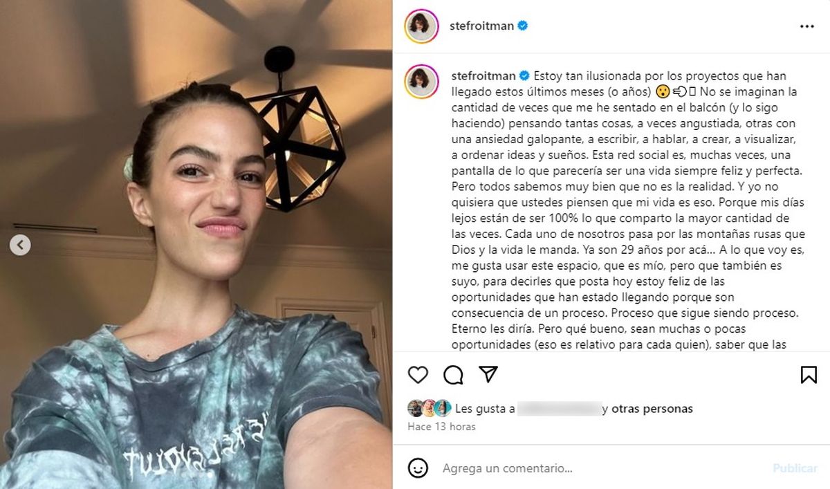 Junto a varias fotografías donde se la ve tanto sonriente como seria, Stefi reflexionó sobre su presente personal y profesional. “Estoy tan ilusionada por los proyectos que han llegado estos últimos meses (o años). No se imaginan la cantidad de veces que me he sentado en el balcón (y lo sigo haciendo) pensando tantas cosas, a veces angustiada, otras con una ansiedad galopante, a escribir, a hablar, a crear, a visualizar, a ordenar ideas y sueños".