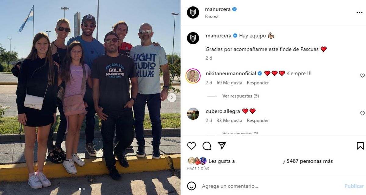 En tanto, ya desde su perfil de la misma red social, Manu Urcera compartió una postal grupal con su inminente familia y su equipo deportivo y otro ¿mensaje indirecto para Indiana?: "Hay equipo. Gracias por acompañarme este finde de Pascuas", a lo que Nicole Neumann respondió inmediatamente con un "Siempre", al tiempo que Allegra Cubero también le demostró su cariño reaccionando con dos corazones.