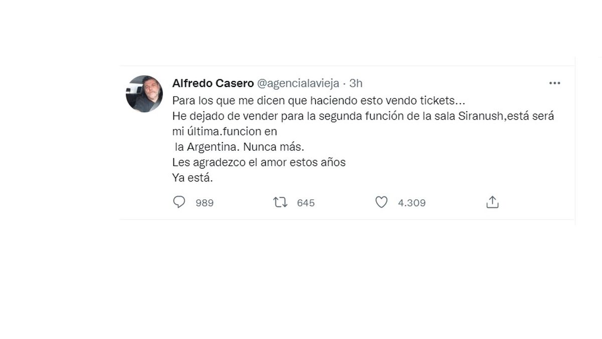 "Para los que me dicen que haciendo esto vendo tickets... He dejado de vender para la segunda función de la sala Siranush, está será mi última función en la Argentina. Nunca más. Les agradezco el amor estos años. Ya está", precisó el actor para sorpresa de todos.
