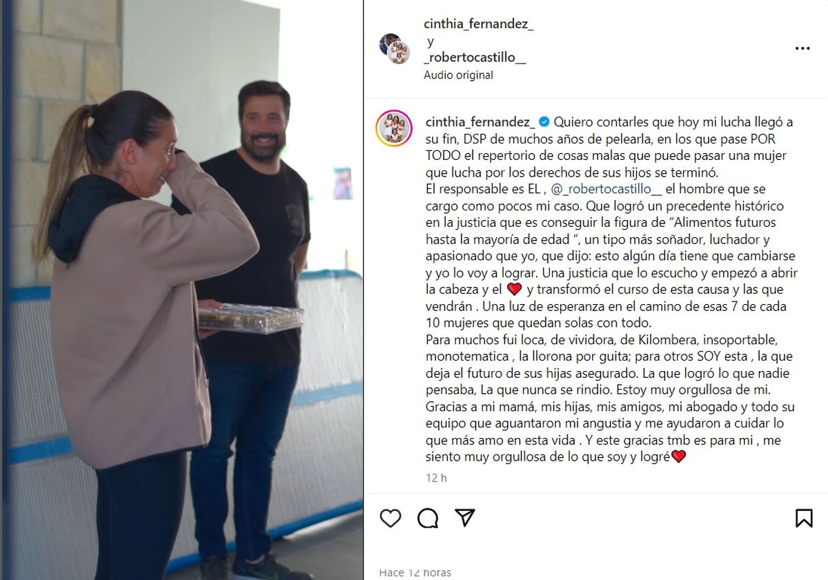 "Para muchos fui loca, de vividora, de quilombera, insoportable, monotemática, la llorona por guita; para otros soy esta, la que deja el futuro de sus hijas asegurado. La que logró lo que nadie pensaba, la que nunca se rindió. Estoy muy orgullosa de mí", comentó Cinthia Fernández.