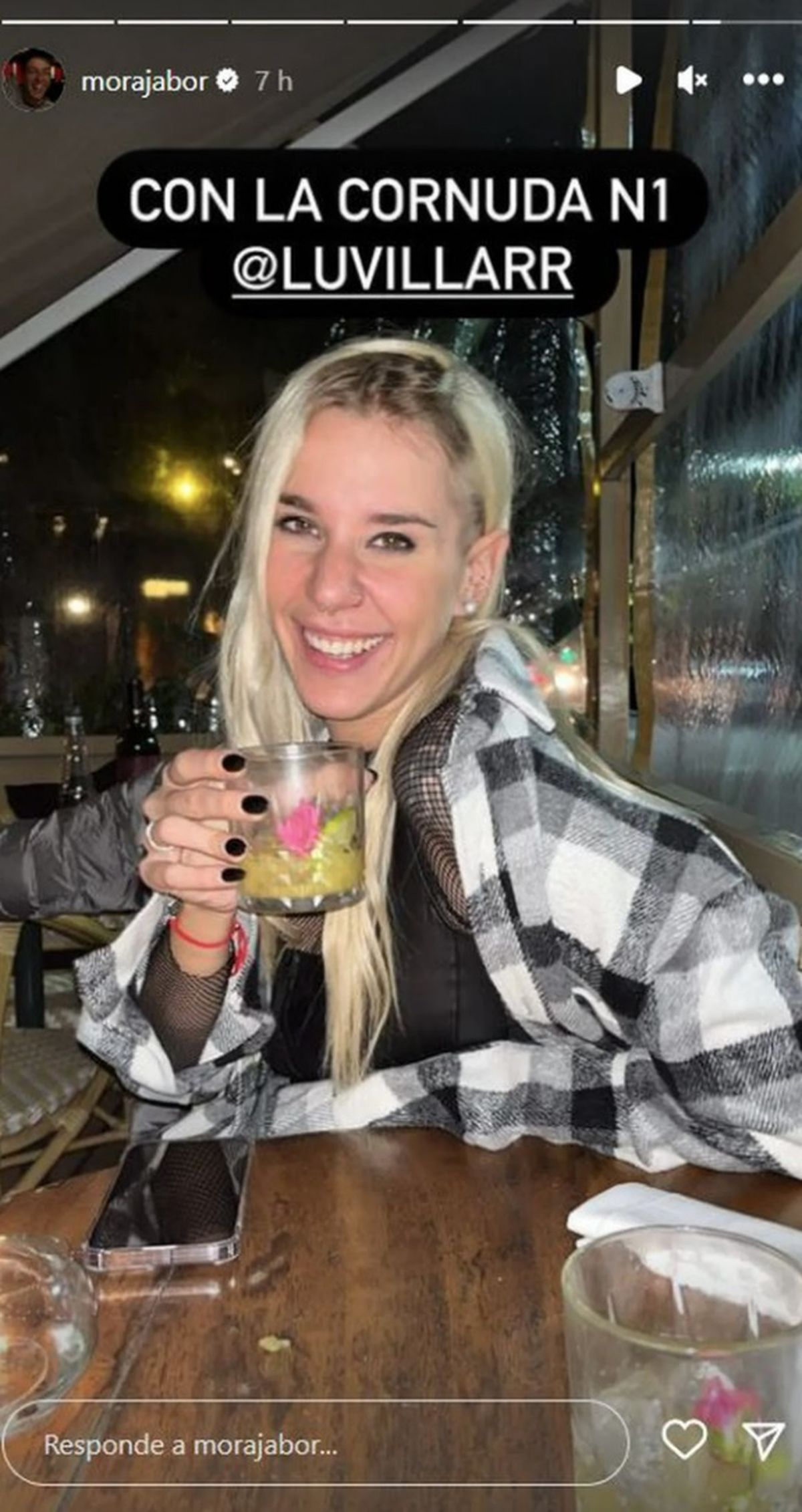 Mora fotografió a su amiga tomando un trago en un bar sonriendo y agregó la categórica frase, incluso arrobándola: "Cornuda número 1", lanzó picante en sus historias.