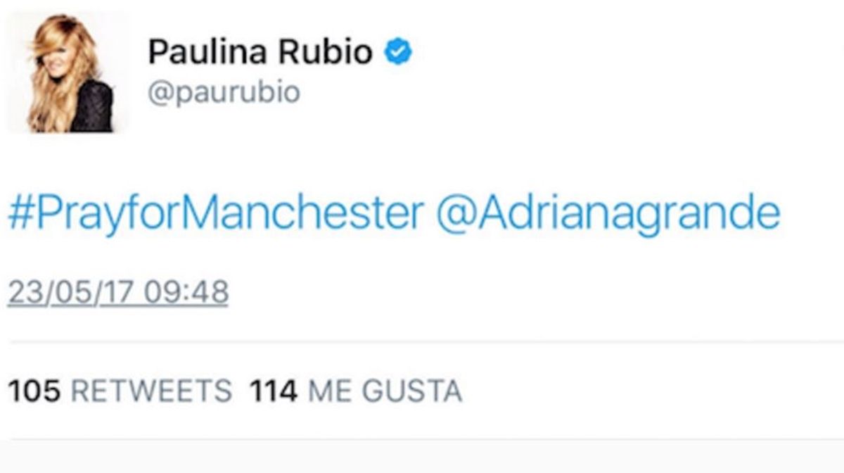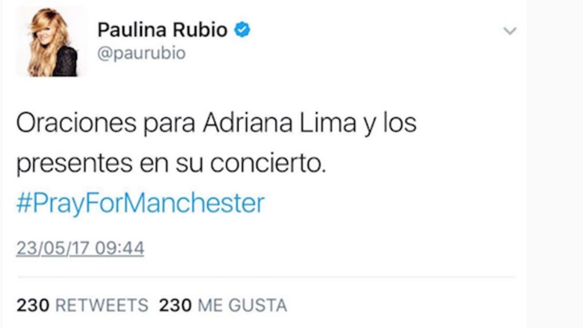 Una de ellas fue la cantante mexicana Paulina Rubio, quien usó su cuenta de Twitter para sumarse a los mensajes de apoyo a las víctimas usando el hashtag #PrayForManchester. Sin embargo, cometió dos errores que de inmediato se viralizaron. El primero fue haber escrito "Adriana Lima" (nombre de una modelo brasileña) en lugar de "Ariana Grande".