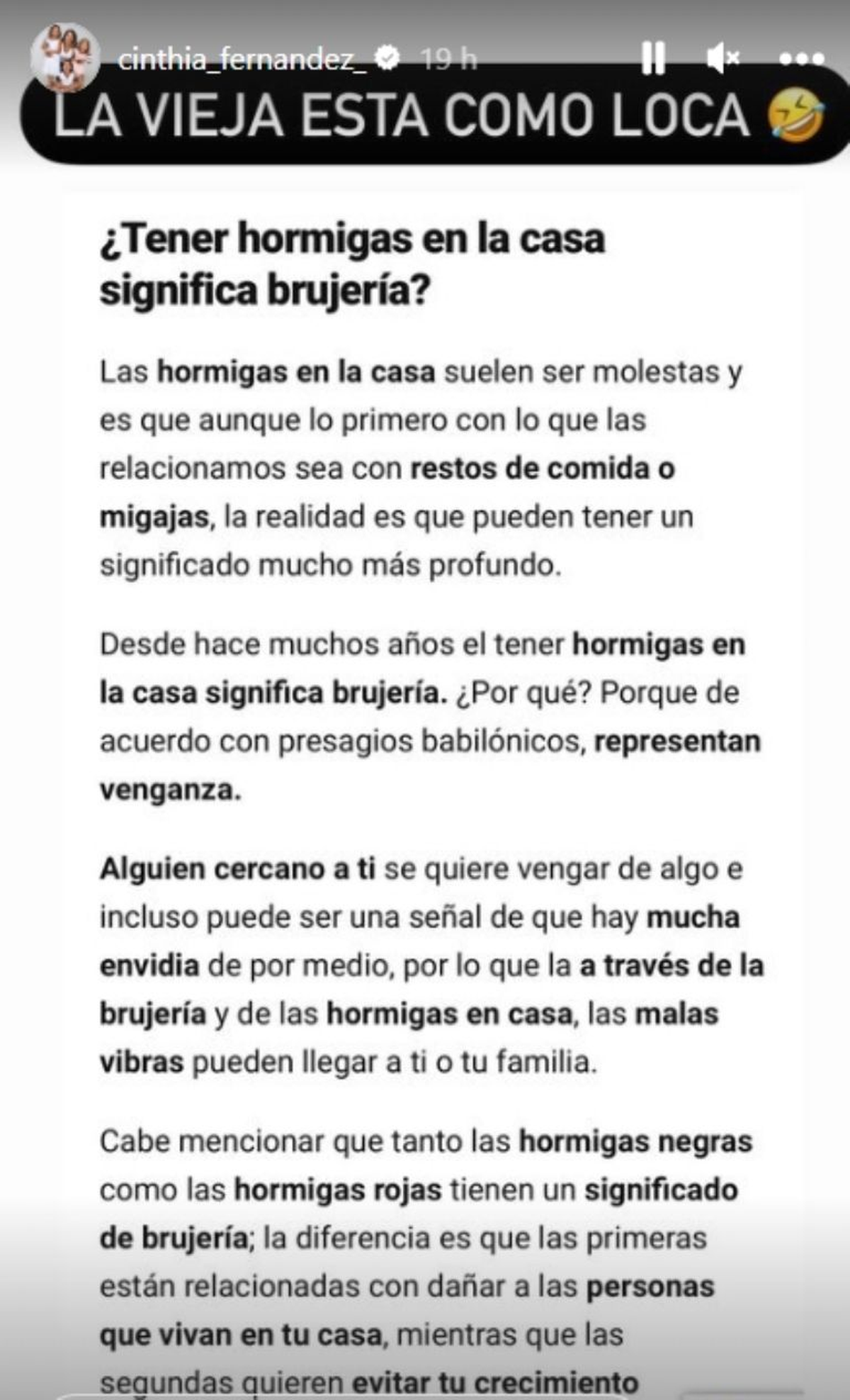 En sus historias en Instagram, Cinthia mostró imágenes de las hormigas en cada rincón del comercio y su gran preocupación por resolver ese tema. Algunos de sus seguidores le dijeron que las hormigas aparecieron porque le hicieron un trabajo de magia negra.