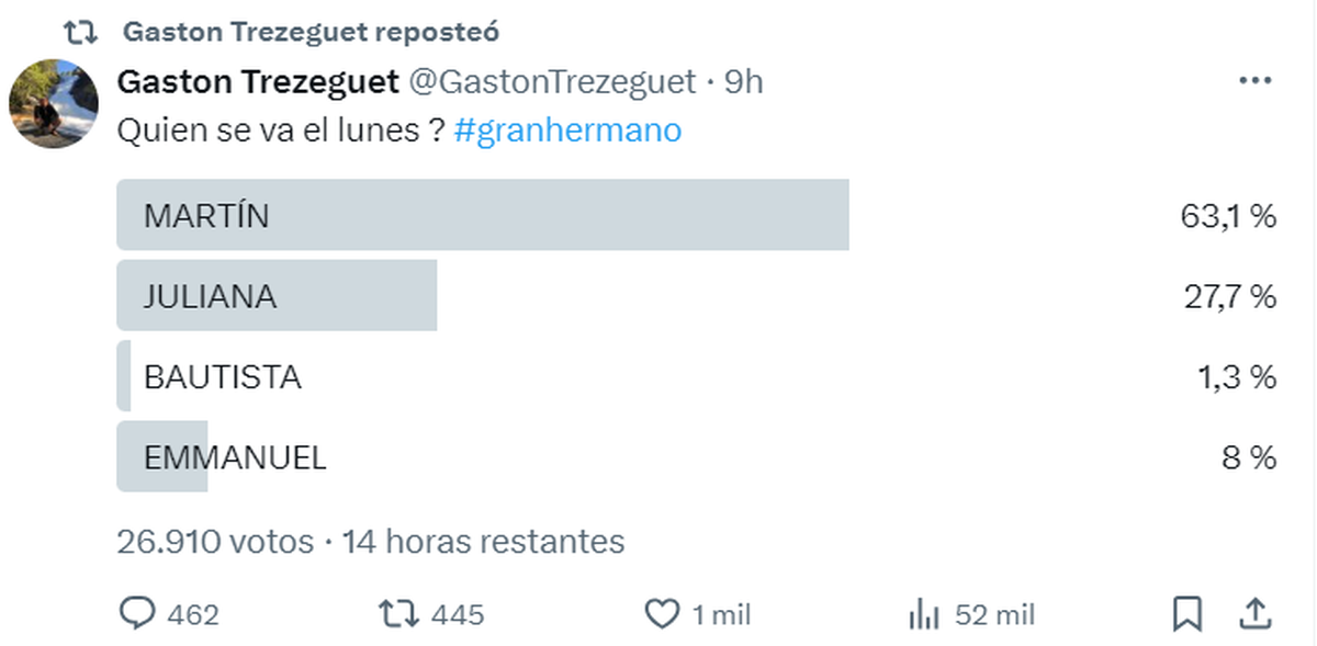 Hasta el momento, con el 63.1% de los votos, Martín Ku quedó como el más votado, es decir, a quien la mayoría quiere eliminar de la competencia. Quien le sigue es Furia con el 27.7%, pero debido a la gran brecha entre ambos, todo apunta a que El Chino sería el eliminado de este lunes en Gran Hermano 2023.