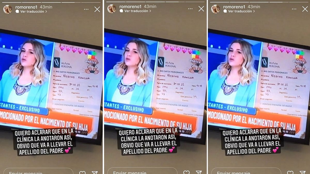 En tanto, Rocío Moreno aclaró que la beba llevará el apellido del padre, ya que fue anotada en la clínica con el materno: "Quiero aclarar que en la clínica la anotaron así, obvio que va a llevar el apellido del padre", manifestó la joven.