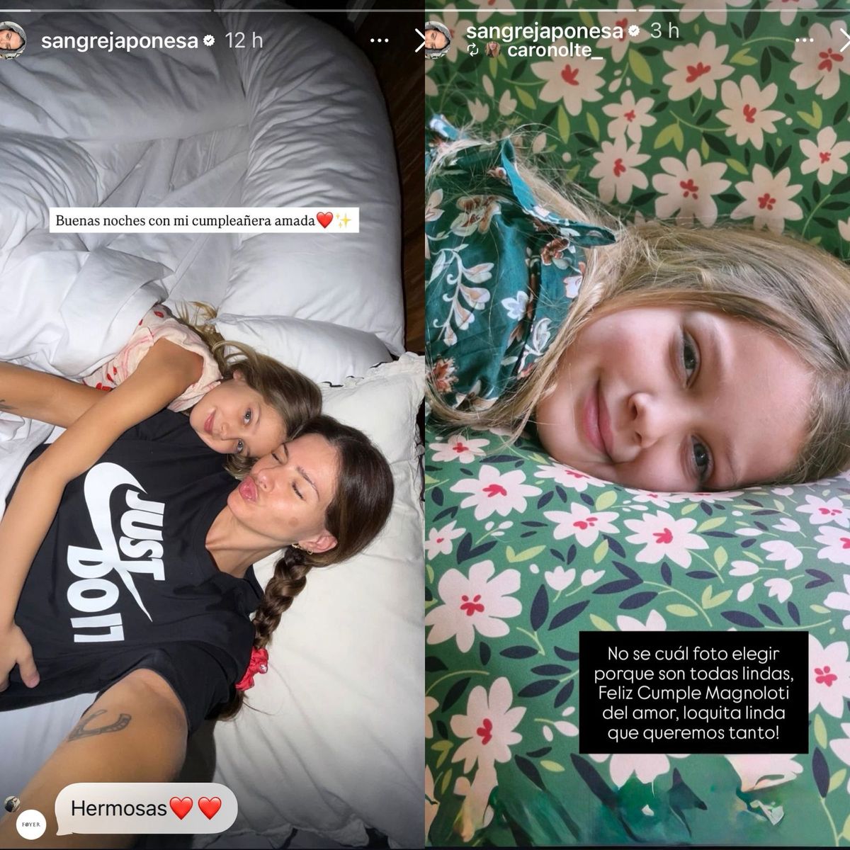 En tanto, desde el lado de su mamá, la China Suárez también saludó y homenajeó a su hija de manera virtual. A las 12 de la noche, justo cuando comenzaba el cumpleaños de Magnolia, la actual pareja de Mauro Icardi compartió en sus Instagram Stories una postal abrazada a la nena en la cama junto a la dedicatoria: "Buenas noches mi cumpleañera amada", al que le agregó un corazón y un emoji de estrellas brillantes.