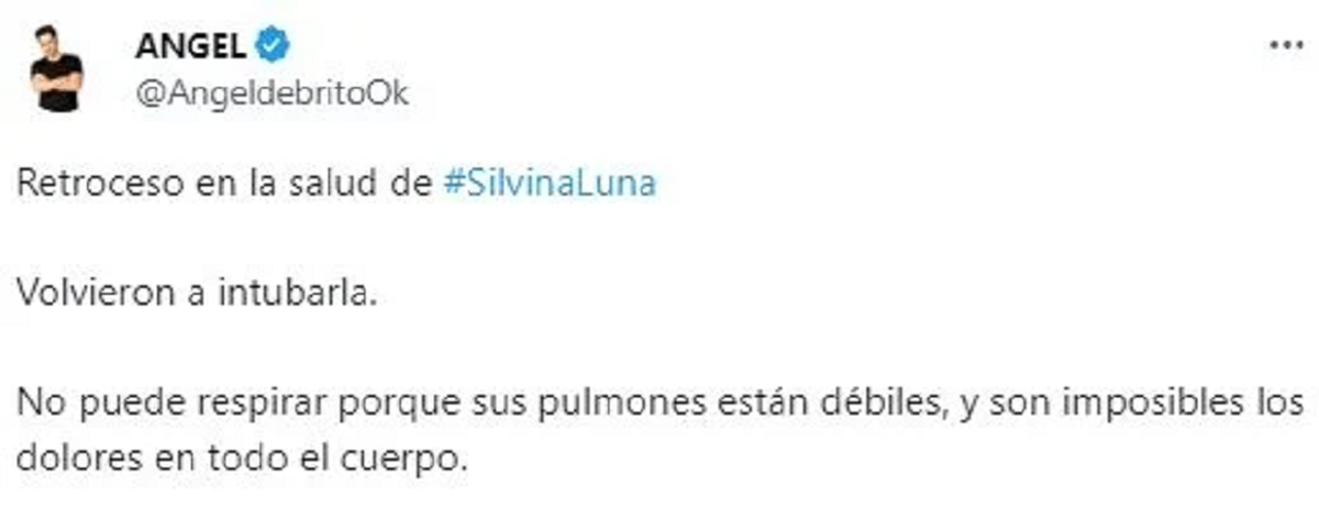 “Retroceso en la salud de #SilvinaLuna. Volvieron a intubarla. No puede respirar porque sus pulmones están débiles y son imposibles los dolores en todo el cuerpo”, indicó el conductor de LAM (América TV) en Twitter.