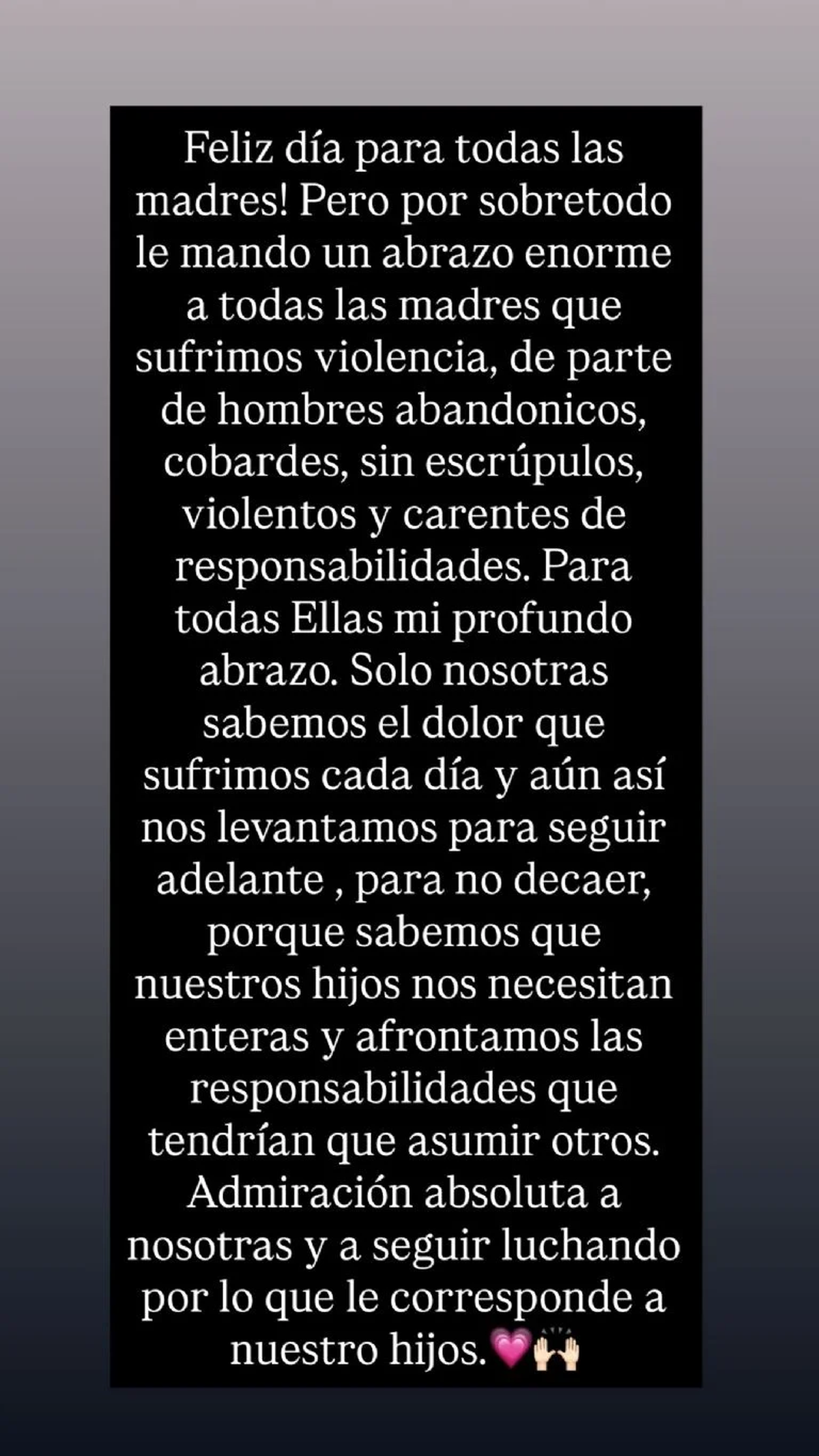 El descargo continuó con la misma intensidad. En otro tramo escribió: "Sólo nosotras sabemos el dolor que sufrimos cada día y aún así nos levantamos para seguir adelante, para no decaer, porque sabemos que nuestros hijos nos necesitan enteras y afrontamos las responsabilidades que tendrían que asumir otros. Admiración absoluta a nosotras y a seguir luchando por lo que le corresponde a nuestros hijos". De esa forma, reafirmó su postura y destacó el rol de las madres que enfrentan la crianza sin acompañamiento.