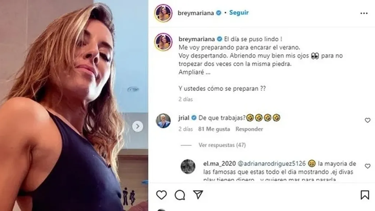 La historia comenzó cuando Brey realizó una publicación en Instagram, y el ex Intrusos le comentó la imagen. “¡El día se puso lindo! Me voy preparando para encarar el verano. Voy despertando. Abriendo muy bien mis ojos para no tropezar dos veces con la misma piedra. Ampliaré… ¿Y ustedes cómo se preparan?”, escribió la ex angelita con unas fotografías súper sensuales.