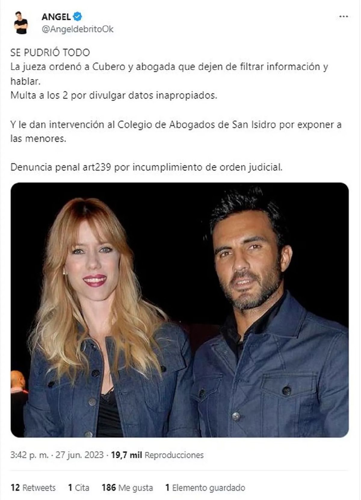 “La jueza cree que la abogada de Cubero infringió la ley en dicho delito porque están en juego los derechos de los niños, y estarían abusando de su indefensión como menores”, agregó de Brito minutos más tarde en un siguiente tuit, dejando clara la determinación de la Justicia sobre el accionar de Cubero y su representante legal, que hizo declaraciones en A la Barbarossa (Telefe), casualmente el programa en el que trabaja su mujer, Mica Viciconte.