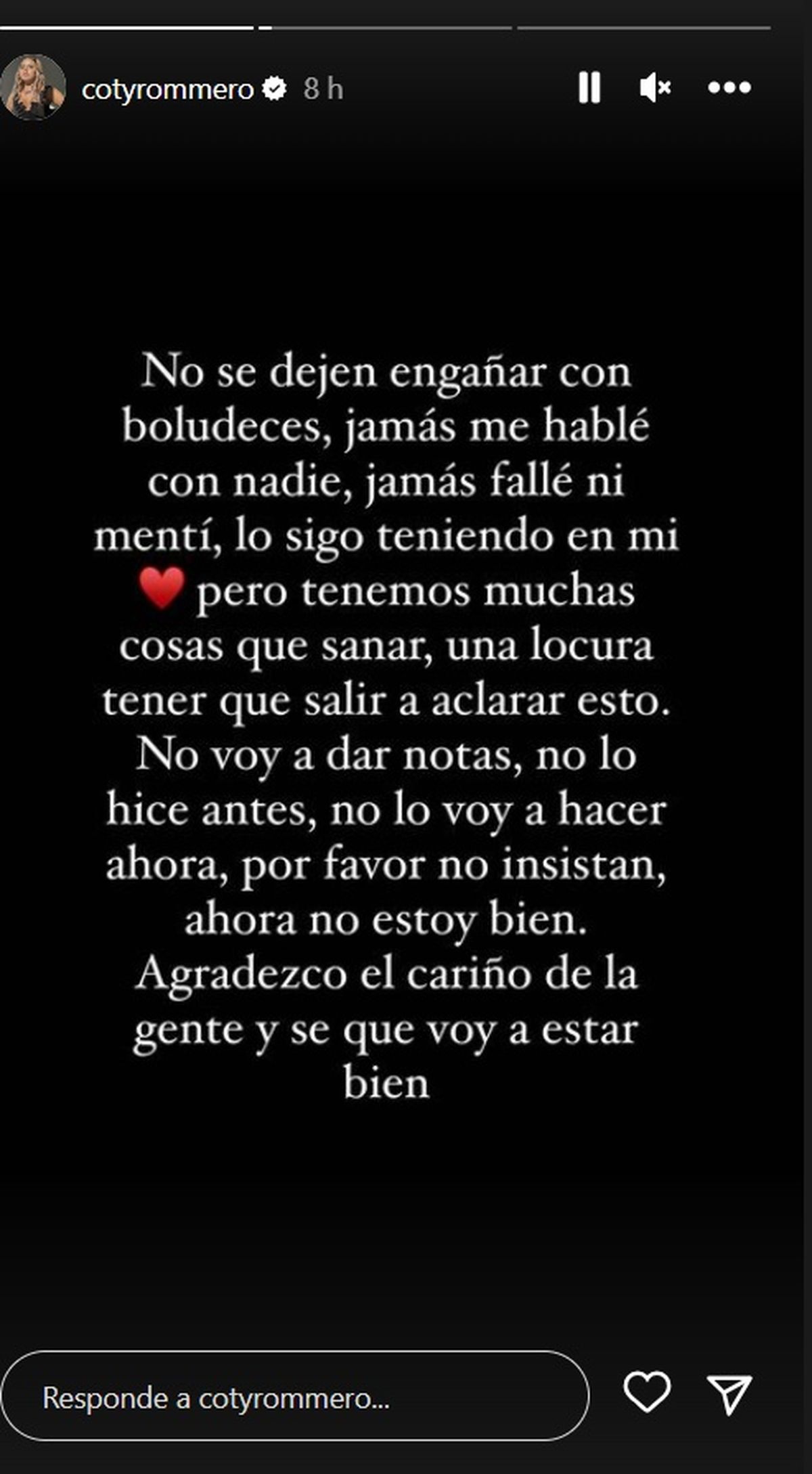 Coti Romero aclaró en otro mensaje además de confirmar su separación que no se habló con nadie en este tiempo y que "no está bien" por el reciente final de relación con el Conejo Alexis Quiroga.