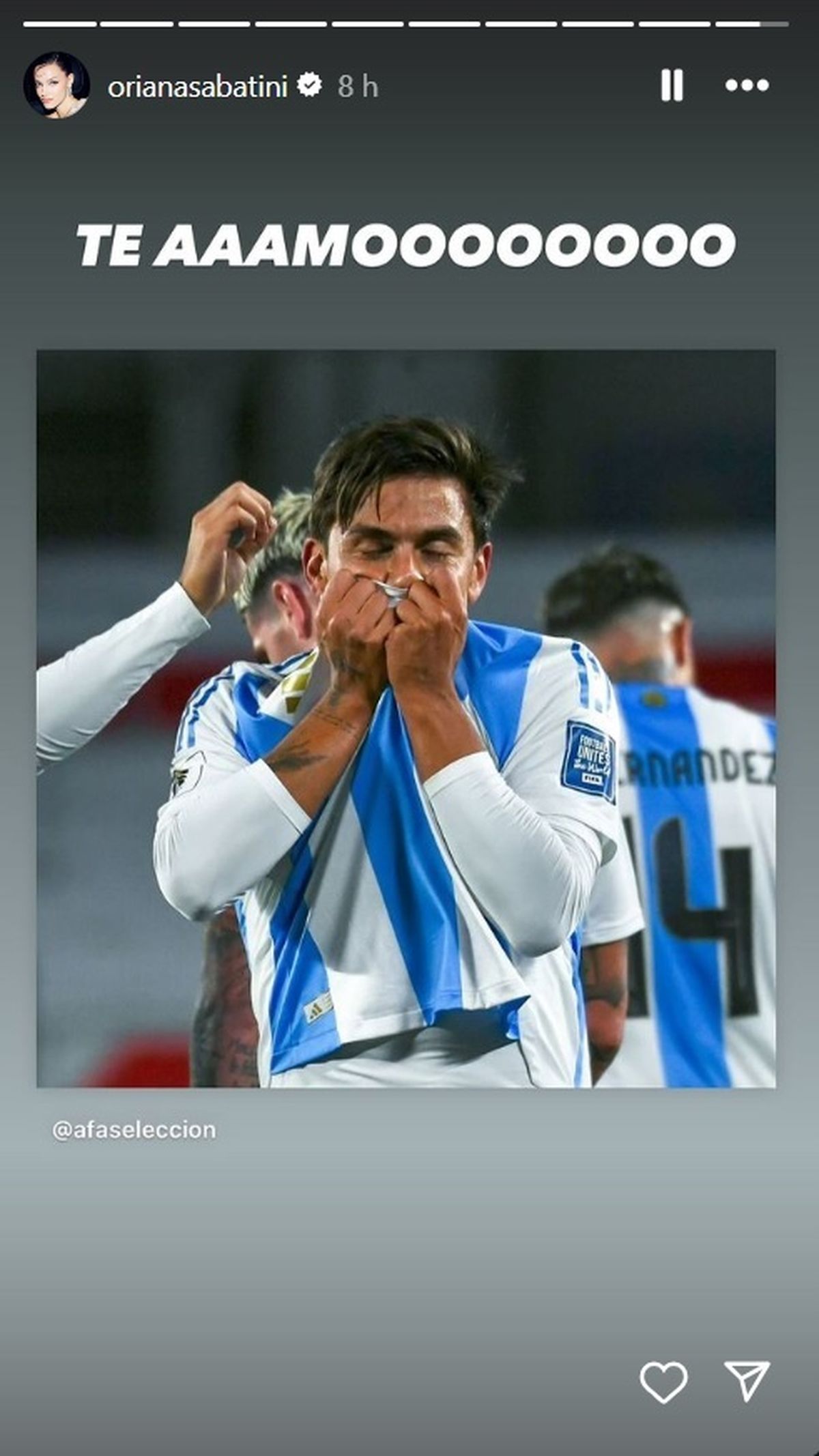 Después, desde sus historias de Instagram, Oriana Sabatini se mostró emocionada por el gran regreso de su esposo a la Selección Argentina tras quedar afuera de la nómina de Qatar 2022 y le dedicó un romántico posteo: "Te amoooo", expresó con una foto de él besando la camiseta argentina.