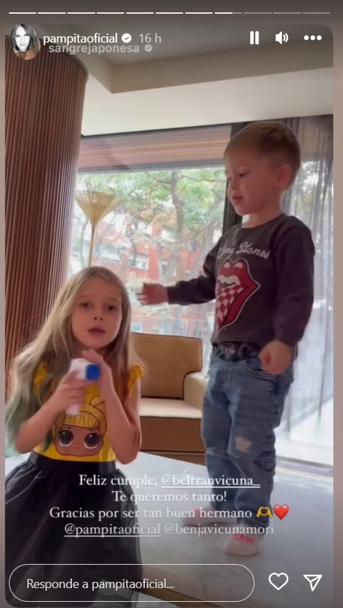 "Feliz cumple Beltrán, te queremos tanto! Gracias por ser tan buen hermano", expresaba la China en el pie de su historia arrobando a Benjamín Vicuña y Pampita con el lindo video de sus hijos saludando a su hermanito.