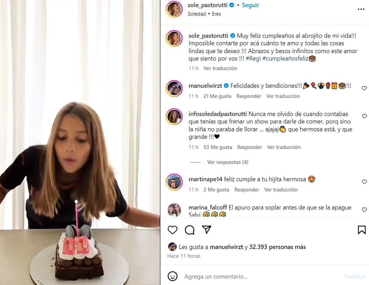 Soledad Pastorutti sorprendió a sus casi dos millones de seguidores de Instagram al mostrar imágenes del íntimo festejo de cumpleaños número 11 de su hija Regina.