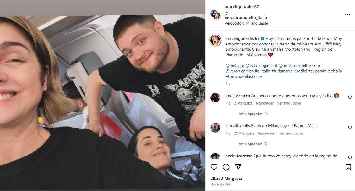 "Hoy estrenamos pasaporte Italiano. Muy emocionados por conocer la tierra de mi bisabuelo! Uffff! Muy emocionante. Ciao Milán Flia Monteferrario. Región de Piamonte. Allá vamos", indicó Araceli González en uno de sus posteos.