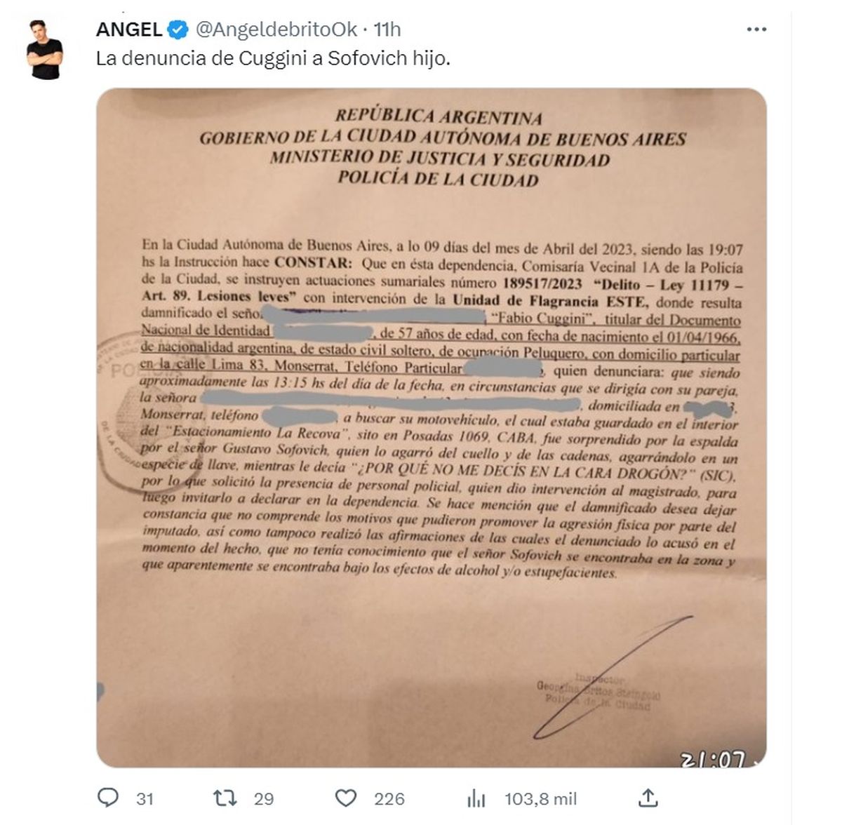 “¡Andá a laburar vago, vago!”, le dijo después Cuggini mientras Sofovich era retirado del lugar. Tremendo escándalo que terminó en denuncia policial de Cuggini al hijo del recordado conductor, documento que mostró Ángel de Brito desde Twitter.