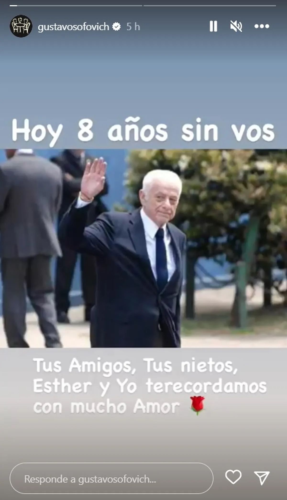 "Hoy 8 años sin vos. Tus amigos, tus nietos, Esther y yo te recordamos con mucho amor", expresó Gustavo con mucho sentimiento.
