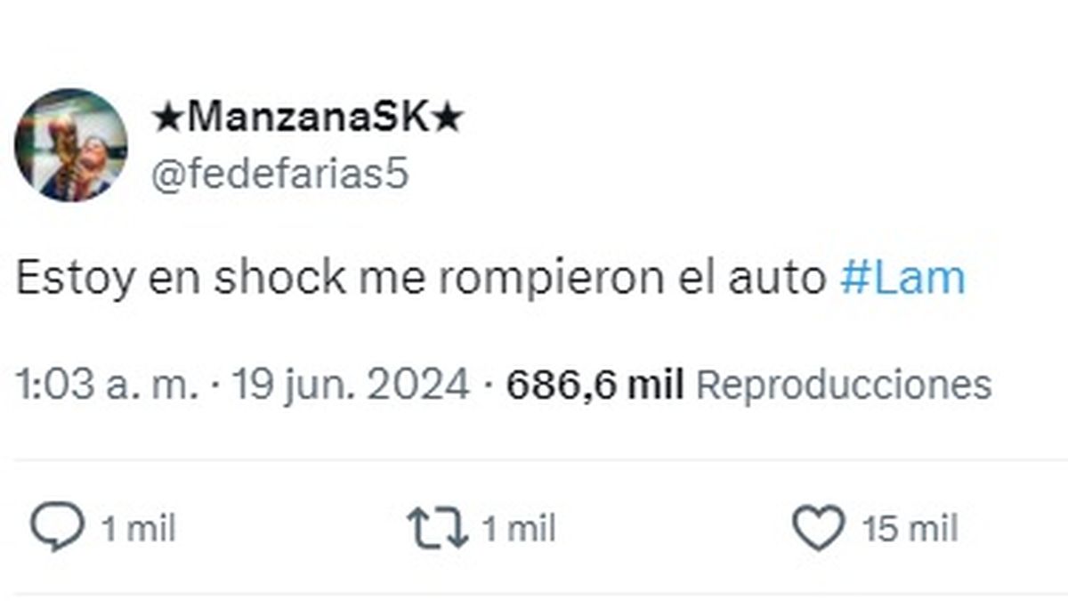 Así como Manzana hizo saber por medio de la misma red social que su auto sufrió agresiones de todo tipo. "Estoy en shock me rompieron el auto".