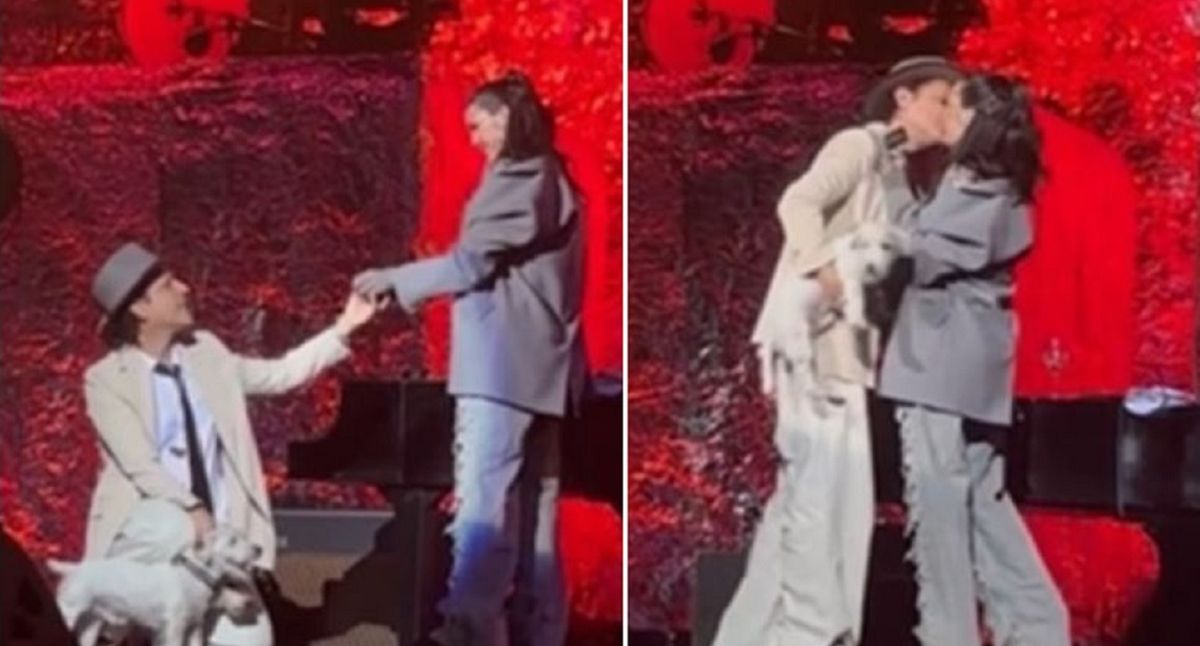 El cantante preparó una gran sorpresa en pleno escenario y con los perros de la pareja incluidos. El músico invitó a su novia a cantar y aprovechó para sorprenderla con un lindo gesto.