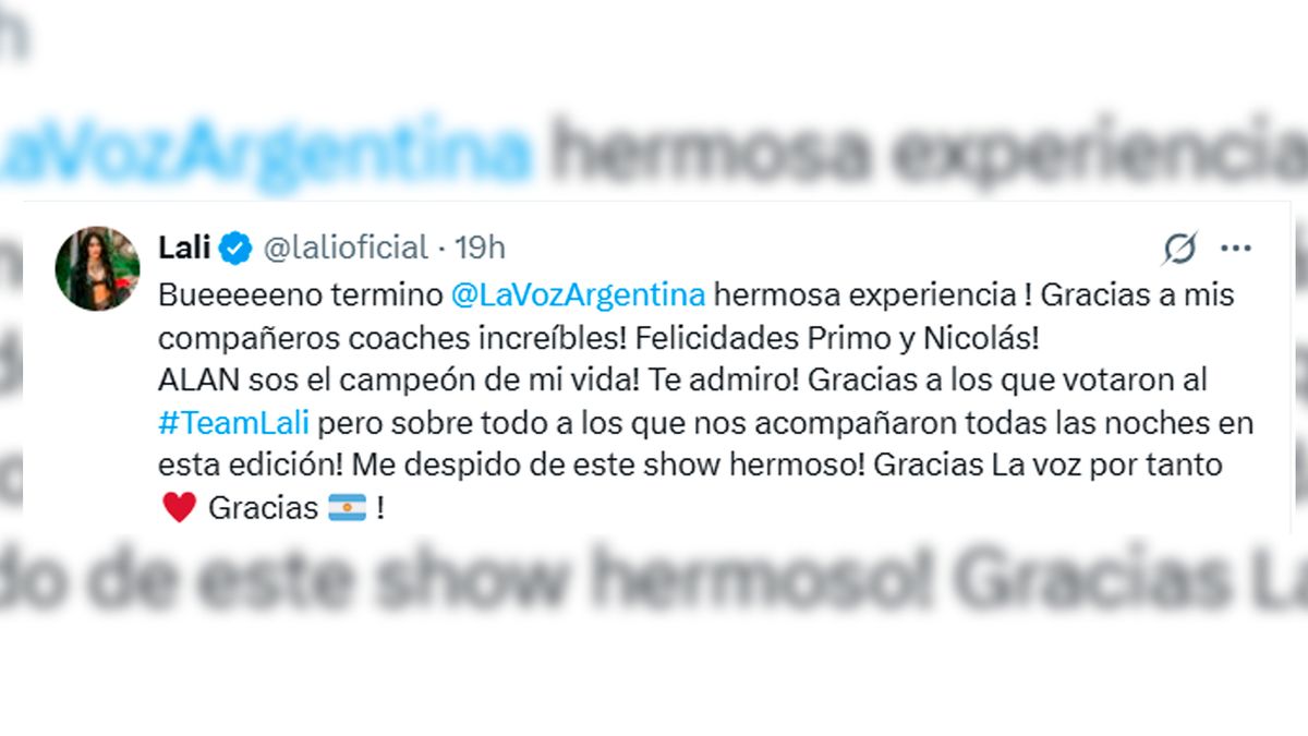 Y finalizó: "Alan sos el campeón de mi vida! Te admiro! Gracias a los que votaron al #TeamLali pero sobre todo a los que nos acompañaron todas las noches en esta edición! Me despido de este show hermoso! Gracias La voz por tanto. Gracias!".