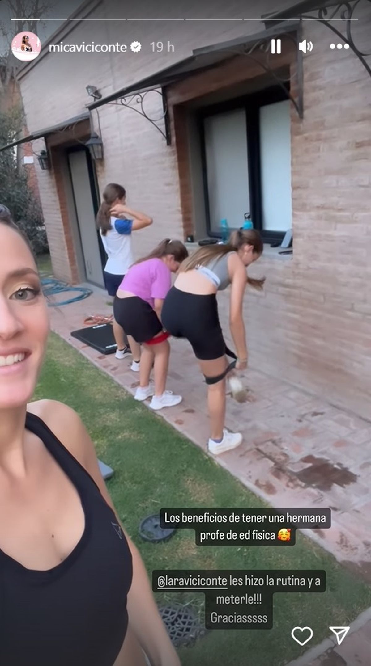 “Los beneficios de tener una hermana profe de educación física. Les hizo la rutina y a meterle! Gracias”, explicó la marplatense en su historia en alusión a Lara Viciconte. Y agregó: “Les hizo la rutina y a meterle”.