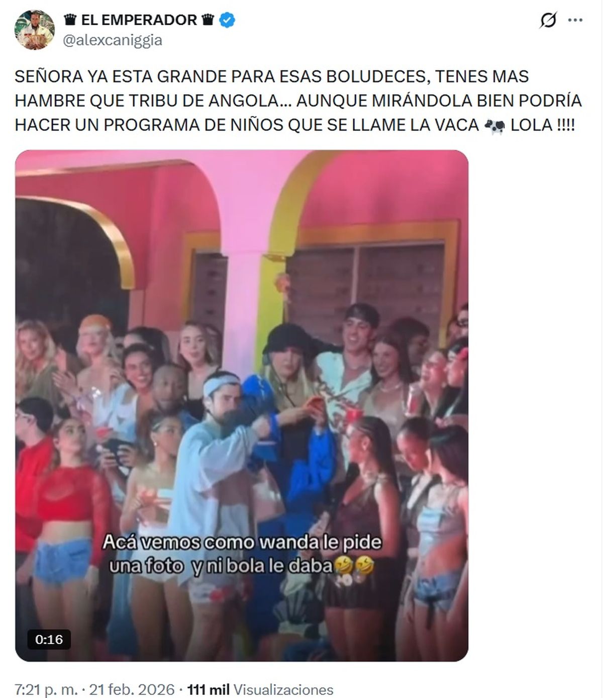En las redes tomó gran viralización el video y esta acción motivó un duro comentario de Alex Caniggia, quien hace un tiempo está enfrentado a Wanda: "Señora ya está grande para esas boludeces, Tenés más hambre que tribu de Angola... Aunque mirándola bien podría hacer un programa de niños que se llame la vaca Lola!!!", lanzó picante desde X.