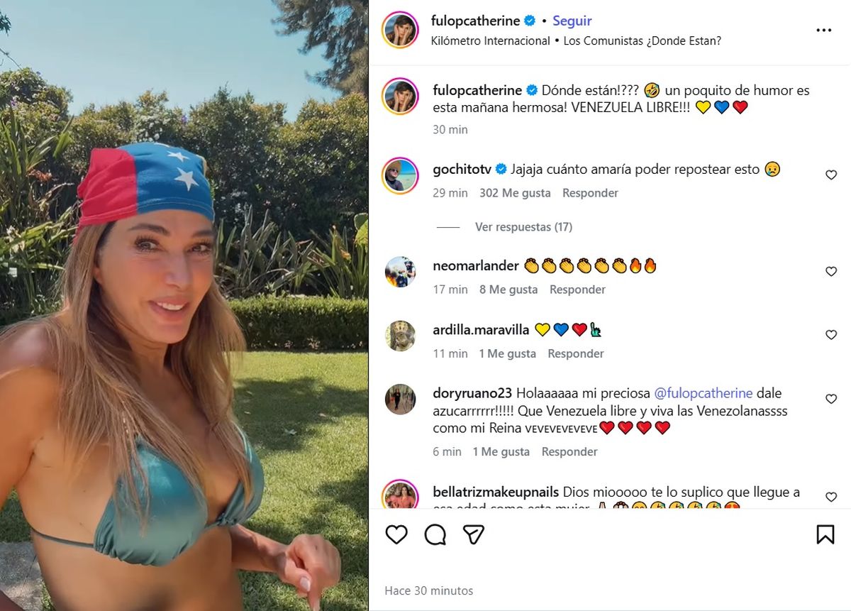 "Dónde están!??? Un poquito de humor es esta mañana hermosa! Venzuela libre!!!", expresó en el mensaje desde su cuenta en Instagram Catherine Fulop este domingo donde se mostró al sol y al aire libre disfrutando de la noticia que sacudió al mundo entero hace unos días.