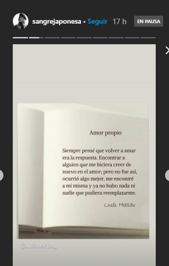 Y en las últimas horas la actriz volvió a acrecentar los rumores tras una curiosa historia que subió a su cuenta de Instagram. “Siempre pensé que volver a amar era la respuesta. Encontrar a alguien que me hiciera creer de nuevo en el amor; pero no fue así, ocurrió algo mejor, me encontré a mí misma y ya no hubo nada ni nadie que pudiera reemplazarme”, dice el texto, escrito por Lucía Herazo.