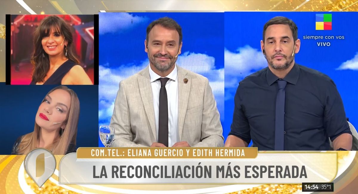 En tanto, en ese preciso momento desde Intrusos pusieron en comunicación a Hermida y lograron así la reconciliación oficial entre ambas. Así, luego de halagar y agradecer la defensa que Beto Casella hizo de ella ante Eliana, la histórica panelista de Bendita (El Nueve) pidió que "este conflicto frene, porque no tiene nigún sentido". "No me gusta estemos mal. De mi parte está todo bien, siempre dije que la admiraba, que me parece una mujer increíble, que se levanta temprano que tiene cuatro pibes de distintas edades... Y me dio pena que no tuvo la oportunidad de seguir trabajando conmigo", confió Edith.