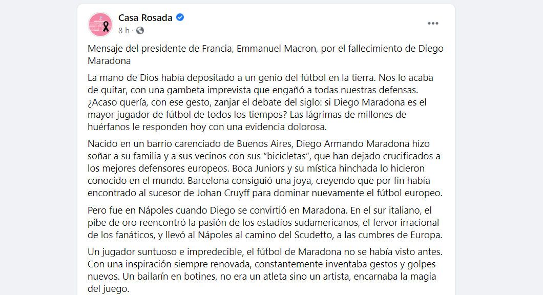 El Presidente de la República saluda al dueño indiscutido de la pelota, tan amado por los franceses. A todos los que ahorraron su mesada para completar el álbum Panini de México 86 con su figurita, a todos los que tuvieron que negociar con su mujer para bautizar Diego a sus hijos, a sus compatriotas argentinos, a los napolitanos que dibujaron frescos dignos de Diego Rivera en su honor, a todos los amantes del fútbol, el Presidente de la República envía su más sentido pésame. Diego se queda.