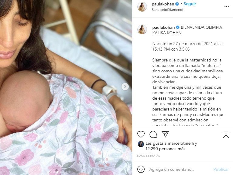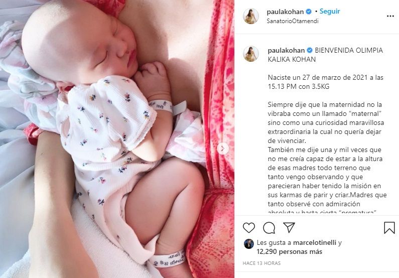 “Qué emoción, amiguita, verte con tu querida Olimpia en brazos, ¡vas a ser una gran madre! ¡Te adoro! Felicitaciones al padrazo @kalikatomas también”, escribió la pareja de Marcelo Tinelli en una historia.
