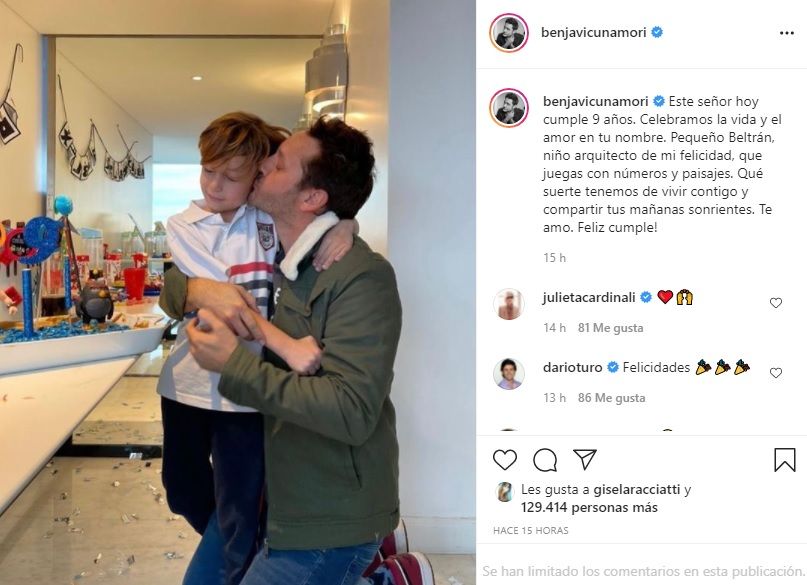 Por su parte, el actor chileno compartió: "Este señor hoy cumple 9 años. Celebramos la vida y el amor en tu nombre. Pequeño Beltrán, niño arquitecto de mi felicidad, que juegas con números y paisajes. Qué suerte tenemos de vivir contigo y compartir tus mañanas sonrientes. Te amo. Feliz cumple!".