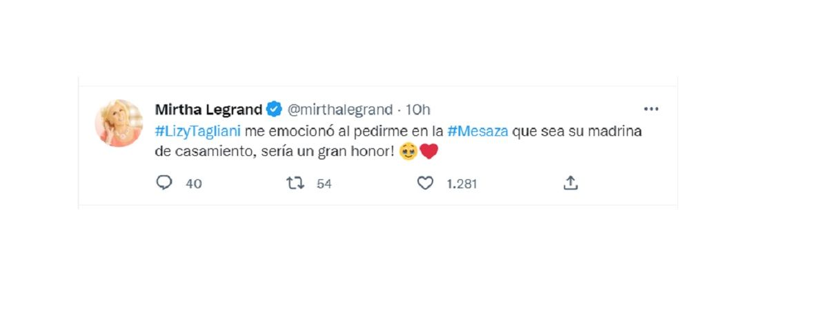 "#LizyTagliani me emocionó al pedirme en la #Mesaza que sea su madrina de casamiento, sería un gran honor!", expresó la conductora.