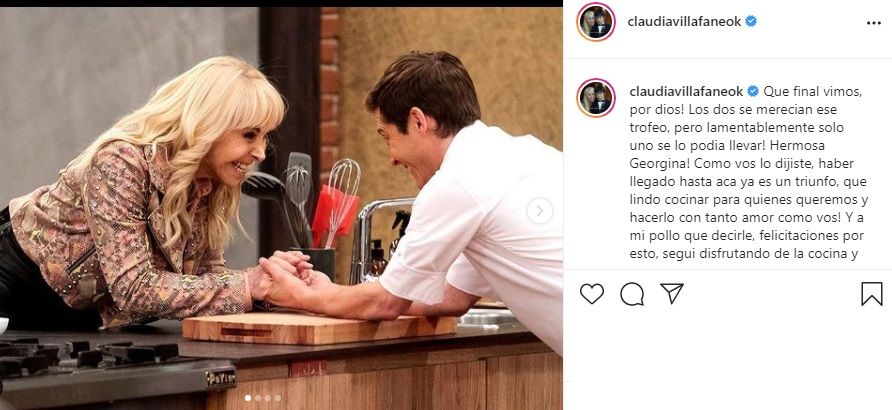 “Y a mí pollo, qué decirle. ¡Felicitaciones por esto, seguí disfrutando de la cocina y de la vida!”, le escribió Claudia al flamante ganador. “¡Desde el día que te entregué el delantal supe que llegarías lejos! ¡Los quiero mucho a los dos!”, concluyó Claudia Villafañe.
