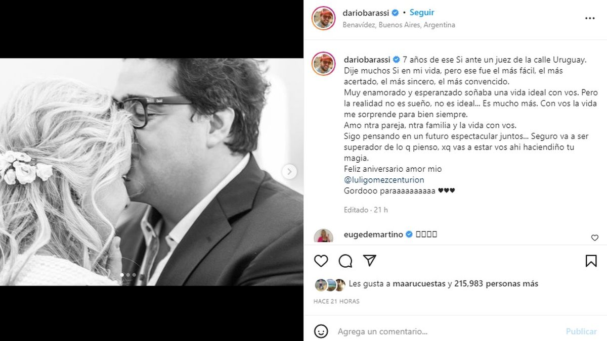 Darío Barassi compartió el domingo un sentido posteo en las redes sociales al cumplirse siete años de su casamiento con Lucía Gómez Centurión, madre de su hija Emilia. El sí del conductor y su mujer se dio en febrero de 2015 y él recordó con emoción aquel importante momento.