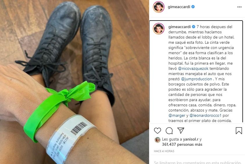 Gimena Accardi compartió un emotivo posteo en Instagram este domingo contando lo que pasó el jueves tras el derrumbe en el edificio en Miami donde se encontraba con su marido, Nicolás Vázquez, y describió con un imagen cómo fueron “clasificados” los heridos que fueron hospitalizados.