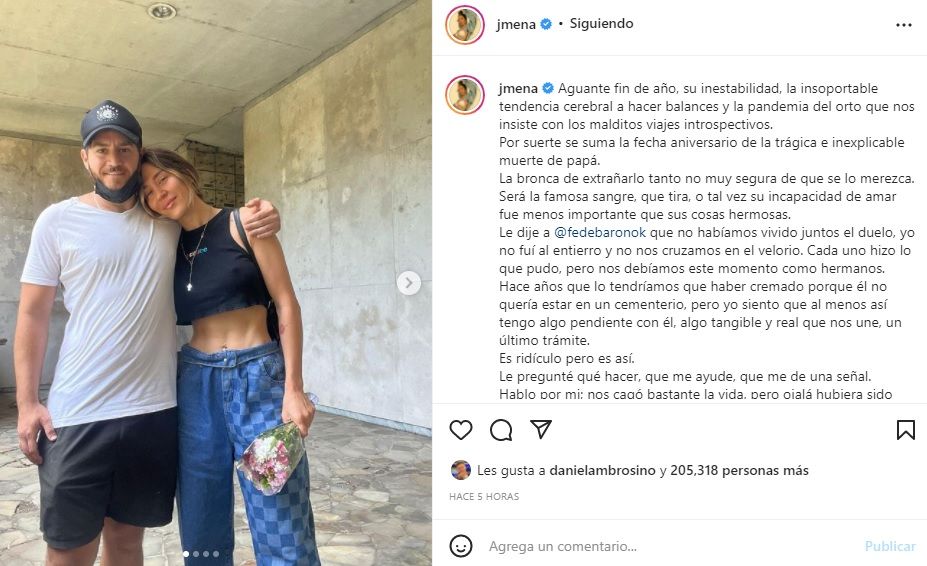 Jimena reveló que decidió ir al cementerio junto a su hermano, Federico. "Le dije a @fedebaronok que no habíamos vivido juntos el duelo, yo no fui al entierro y no nos cruzamos en el velorio. Cada uno hizo lo que pudo, pero nos debíamos este momento como hermanos", precisó.