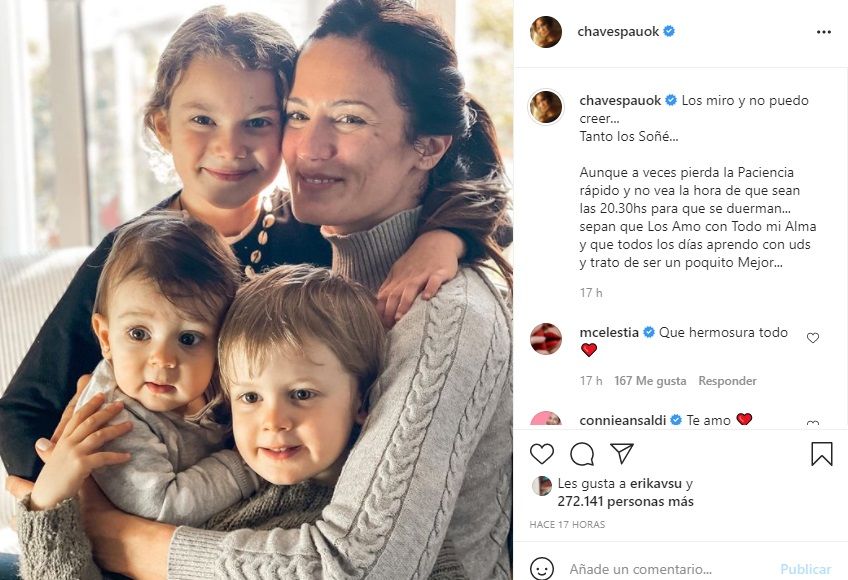 Y siguió: "Aunque a veces pierda la paciencia rápido y no vea la hora de que sean las 20.30 horas para que se duerman... sepan que los amo con todo mi alma y que todos los días aprendo con ustedes y trato de ser un poquito mejor...".