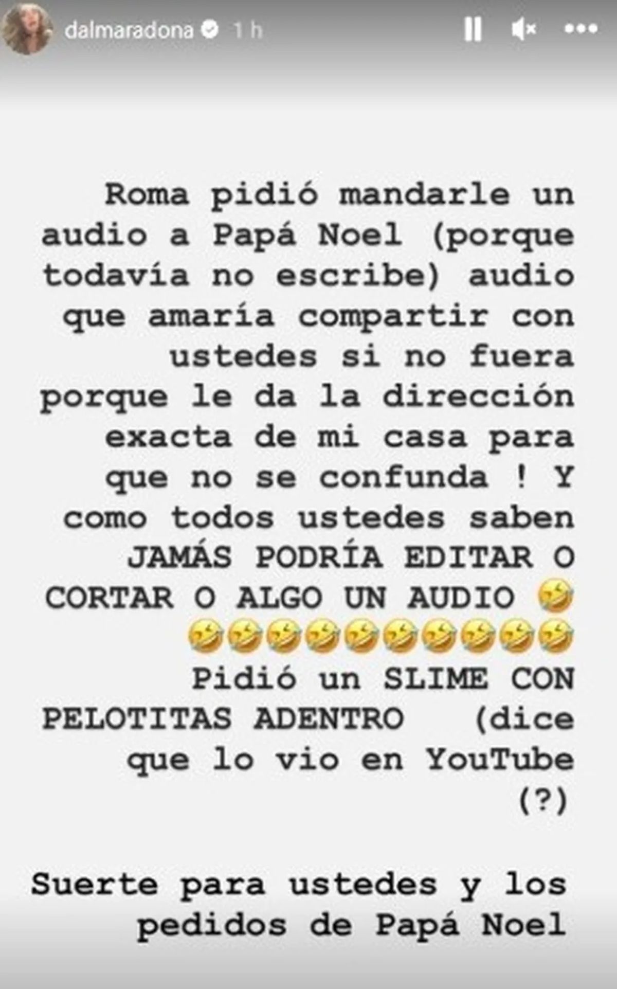 "Roma pidió mandarle un audio a Papá Noel (porque todavía no escribe) audio que amaría compartir con ustedes porque le da la dirección exacta de mi casa para que no se confunda", comenzó diciendo Dalma en una Instagram Stories.
