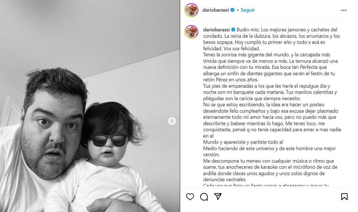 "Hija ejemplar y hermana adorable. Inés, te amo. Con locura te amo. Para siempre te amo. Gracias x llegar, te estábamos esperando. Primer año cumplido. Que linda es la vida con vos. Festeja amor mío que de eso usted sabe!!! Por ahora no creo que puedas pensar tus deseos, igual olvídate que en mi listado de pendientes esta ocuparme de hacer real y posible todo lo que se te cruce por el corazón y la cabeza. Coma rica, baile mucho, estrene triciclo, grite y robe galletitas. Hoy es su día. Mañana y el resto de los días también, pero shhh ese es nuestro secreto. Te amo", cerró Darío Barassi.
