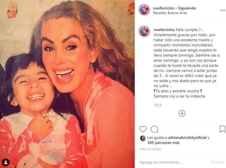 “¡Feliz cumple! Simplemente, gracias por todo, por haber sido una excelente madre y compartir momentos inolvidables. Cada recuerdo que tengo nuestro, lo llevo siempre conmigo. Siempre vas a estar conmigo y yo con vos porque, cuando te fuiste, te llevaste una parte de mí. Siempre vamos a estar juntas las tres. A veces es difícil creer que ya no estás y nos duele, pero sé que ya no sufrís. Te amo y extraño mucho. Siempre voy a ser tu indiecita”, manifestó Noelia Ferriols, junto a una foto en la que se la ve con la artista.