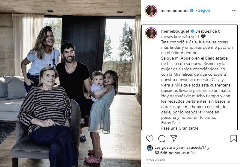 "Se que mi abuelo en el cielo estaba de fiesta con su nueva bisnieta y la mujer de su vida conociéndose. Yo con la mía felices de que conociera nuestra nueva hija, nuestra casa y viera a Mila que toda esta cuarentena quisimos llevarle pero no se animaba", explicó.