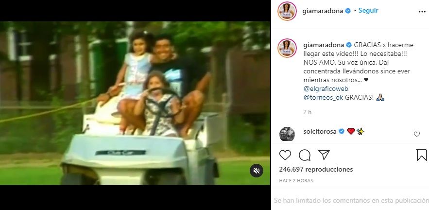 Gianinna Maradona compartió este miércoles un emotivo video donde se la ve a ella y su hermana Dalma junto a su padre Diego Armando Maradona paseando en un carrito por un jardín.