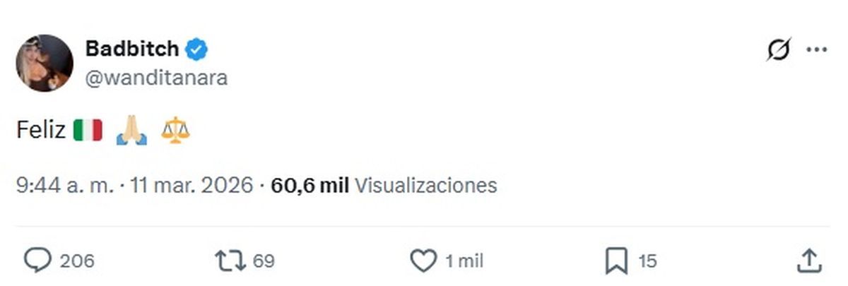 "Feliz", fue la única palabra que tuiteó Wanda junto a un emoji de la bandera de Italia, dos manos unidas en señal de agradecimiento y el símbolo de a Justicia.